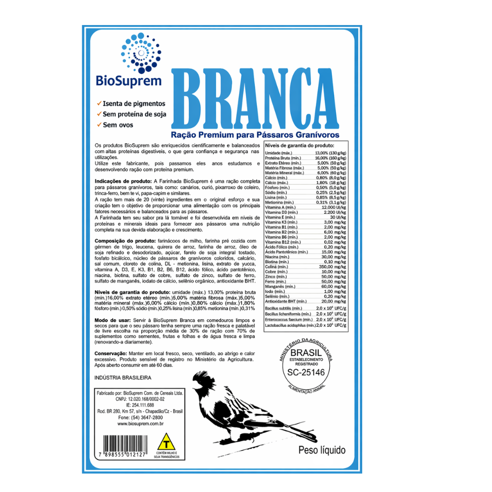 Farinhada BioSuprem Branca é uma ração premium, formulada especialmente para pássaros que precisam manter a máxima intensidade de cor. Livre de pigmentos, com granulometria fina e homogênea, esta farinhada é ideal para aves que exigem uma alimentação que não interfere na eficácia dos corantes, como a cantaxantina e a luteína.