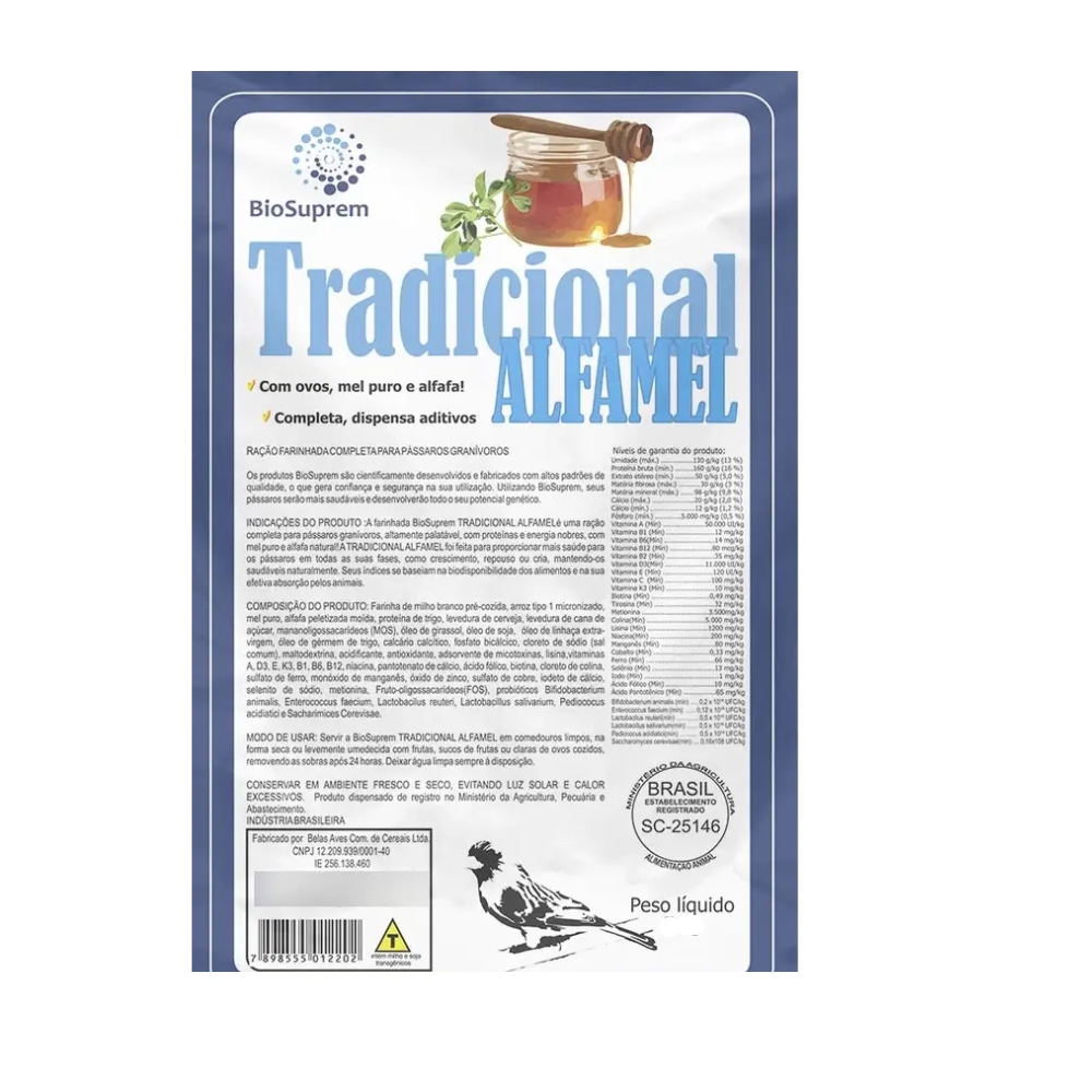 Biosuprem Tradicional Alfamel é uma farinhada completa Super Premium com baixo nível de pigmentantes, com ovos integrais liofilizados e proteína de soja, destinada a todos os pássaros granívoros. Altamente palatável e completa. A mesma qualidade superior da Tradicional, mas com os benefícios nutricionais do mel puro e da alfafa peletizada. Propicia alta qualidade nutritiva, mantendo naturalmente a saúde dos pássaros. Especialmente indicada para períodos de cria e pós-cria, na recuperação rápida dos pássaros.