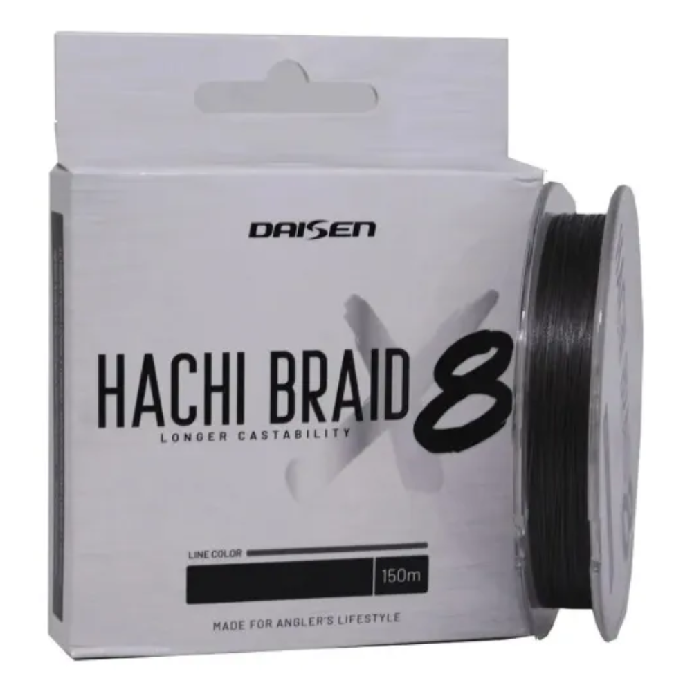 A linha de Multifilamento Hachi Super Braid X8 da Daisen é uma excelente opção na relação custo x benefício, produzida em Taiwan com as melhores tecnologias, possui um trançado mais forte, com altíssima resistência a tensão, com alta impermeabilidade, sem memória e seu coeficiente de elasticidade é próximo de zero, o que torna as fisgadas muito mais certeiras.