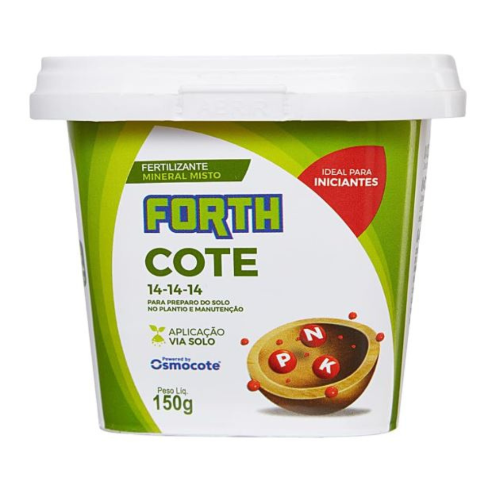 Fertilizante 14-14-14 com 400g Classic 3M Forth Cote Economia, Eficiência e Ecologia. O que a planta precisa, quando ela precisa e pelo tempo que ela precisa. Fertilizantes NPK ou NPK+Mg+ME de liberação controlada, recobertos com uma resina orgânica biodegradável, para uso em viveiros, estufas, transplantes de mudas, entre outros cultivos. Esse conjunto de cápsulas formam grãos uniformes, que facilitam o manuseio e aplicação, garantindo melhor distribuição dos elementos contidos no produto. Projetado para nutrir a cultura durante todo o seu ciclo de crescimento, libera nutrientes vitais de forma controlada em termos de dosagem e no momento exato de sua absorção. Reduz drasticamente o uso de mão de obra, elimina o risco de salinização, e proporciona uma qualidade superior às plantas. A escolha do produto e doses de aplicação dos produtos deve ser baseada nas práticas individuais de consumo. Usar menor dose em solos pesados ou argilosos e doses mais altas em solos leves e arenosos. Recomendações gerais: - Indicado para uso em viveiros, estufas, transplante de muda para campo, entre outros usos em campo aberto. - Tecnologia de última geração, FORTH COTE contém todos os nutrientes em cada grânulo, o que garante melhor distribuição dos elementos contidos no produto. - Produto para uso exclusivo como fertilizante.