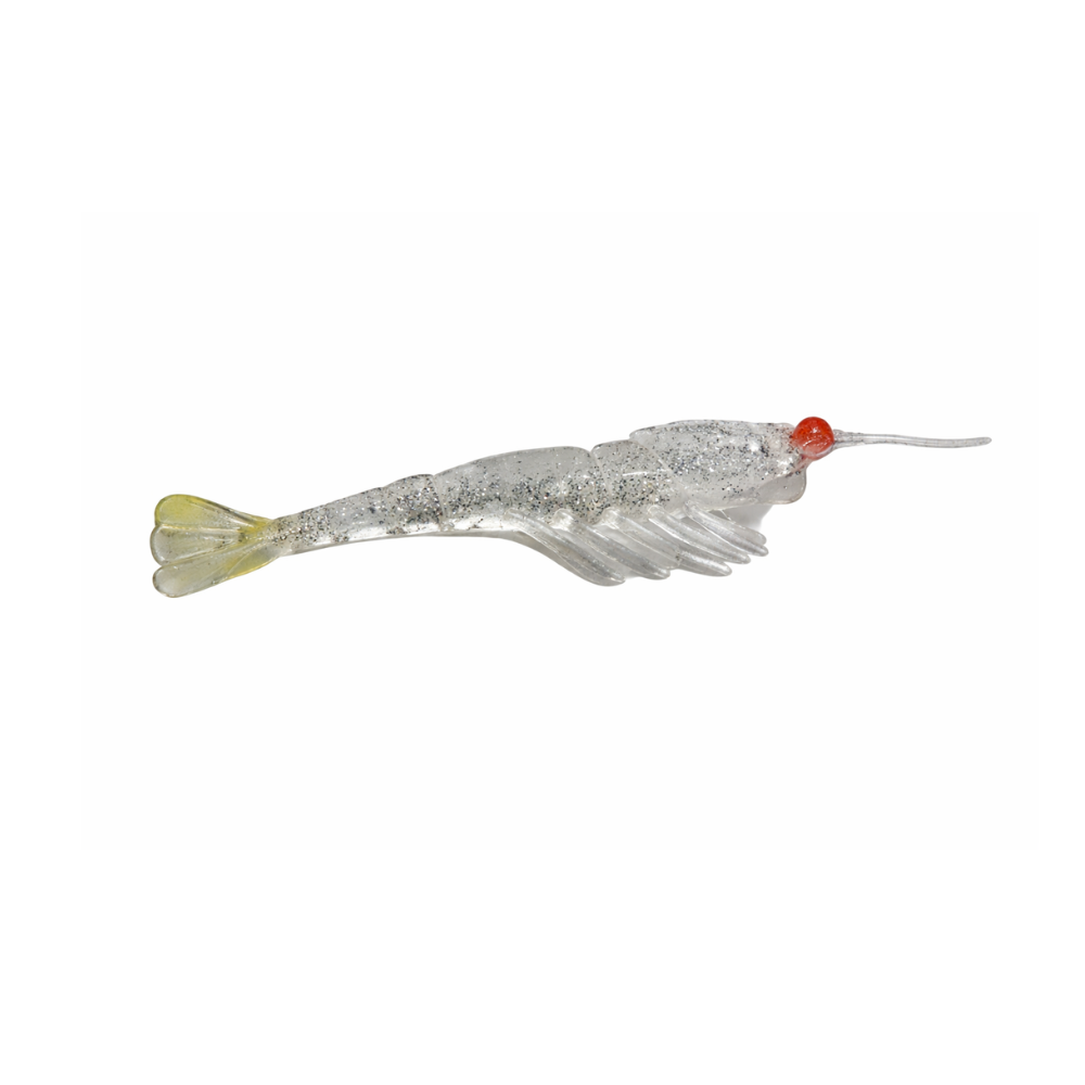é perfeita para pescadores que buscam alto desempenho e realismo na água. Produzida em silicone macio e resistente, possui corpo translúcido com brilho (glitter), imitando com fidelidade um camarão natural — presa comum de diversos peixes predadores.