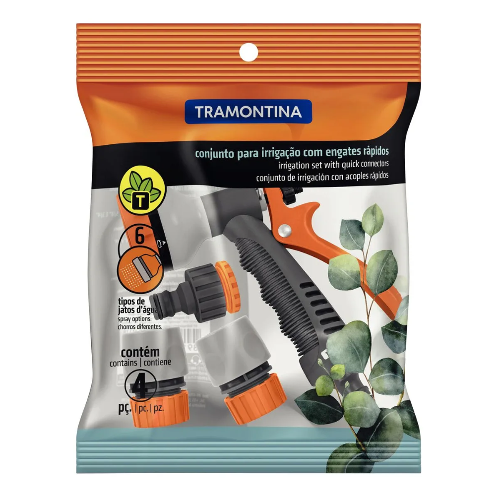 O Conjunto Irrigação Engates Rápidos E Hidropistola 4 peças da Tramontina é ideal para serviços de jardinagem, possibilitando uma irrigação precisa e segura. Contém 1 unidade do adaptador fêmea com rosca externa 3/4'' e redução 1/2'' em plástico, 2 unidades de engate rápido em plástico para mangueiras 1/2'', e 1 unidade da hidropistola para engate rápido com jato controlável.